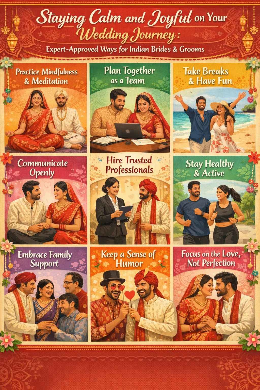Staying Calm and Joyful on Your Wedding Journey: Expert Approved Ways for Indian Brides and Grooms. The journey to your wedding day is a tapestry of vibrant traditions, heartfelt moments, and ecstatic celebrations. Yet, amidst the flurry of rituals and planning, many brides, grooms, and their families experience bouts of anxiety and overwhelming nerves. It is entirely natural after all, an Indian wedding is much more than an event; it is the commencement of a new life chapter. The key to truly glowing on your special day lies in nurturing calmness and joy, so every moment is cherished and remembered fondly. Here, discover practical, expert-backed strategies to remain composed, focused, and radiant through every step of your wedding journey.